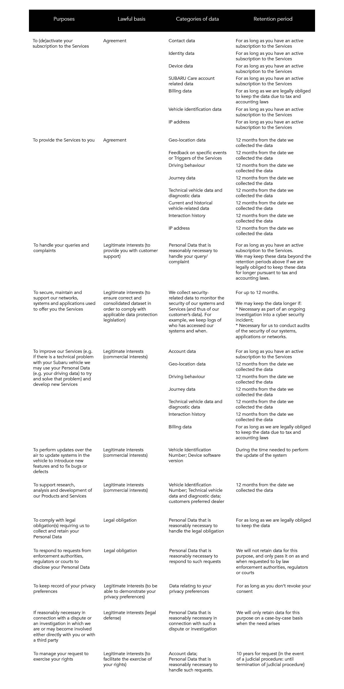 When providing Services to you, and depending on your vehicle’s model and on the subscription you took, Subaru is responsible for the processing of your Personal Data. We are what the GDPR refers to as the “controller” of your Personal Data. In concrete terms, this means that Subaru, possibly along with any others, determines the purpose and means for the processing of your Personal Data.