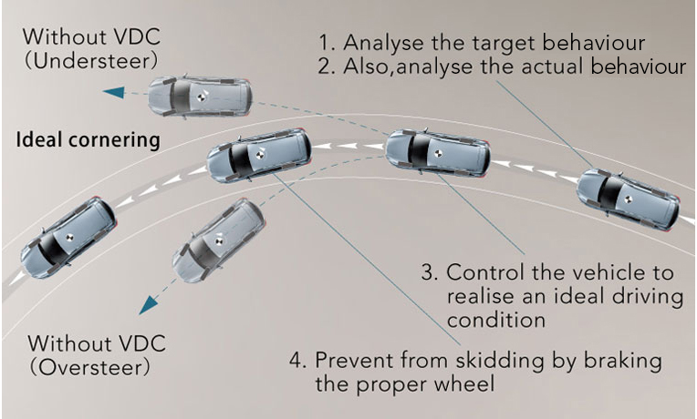 Vehicle Dynamics Control is an electronic device that prevents the car from skidding when it experiences a loss in stability, by constantly monitoring driving conditions from the steering angle, engine speed, gear selection and the brake position. It controls the brakes if the car starts behaving irregularly, and is effective when the car is about to slip sideways when cornering.